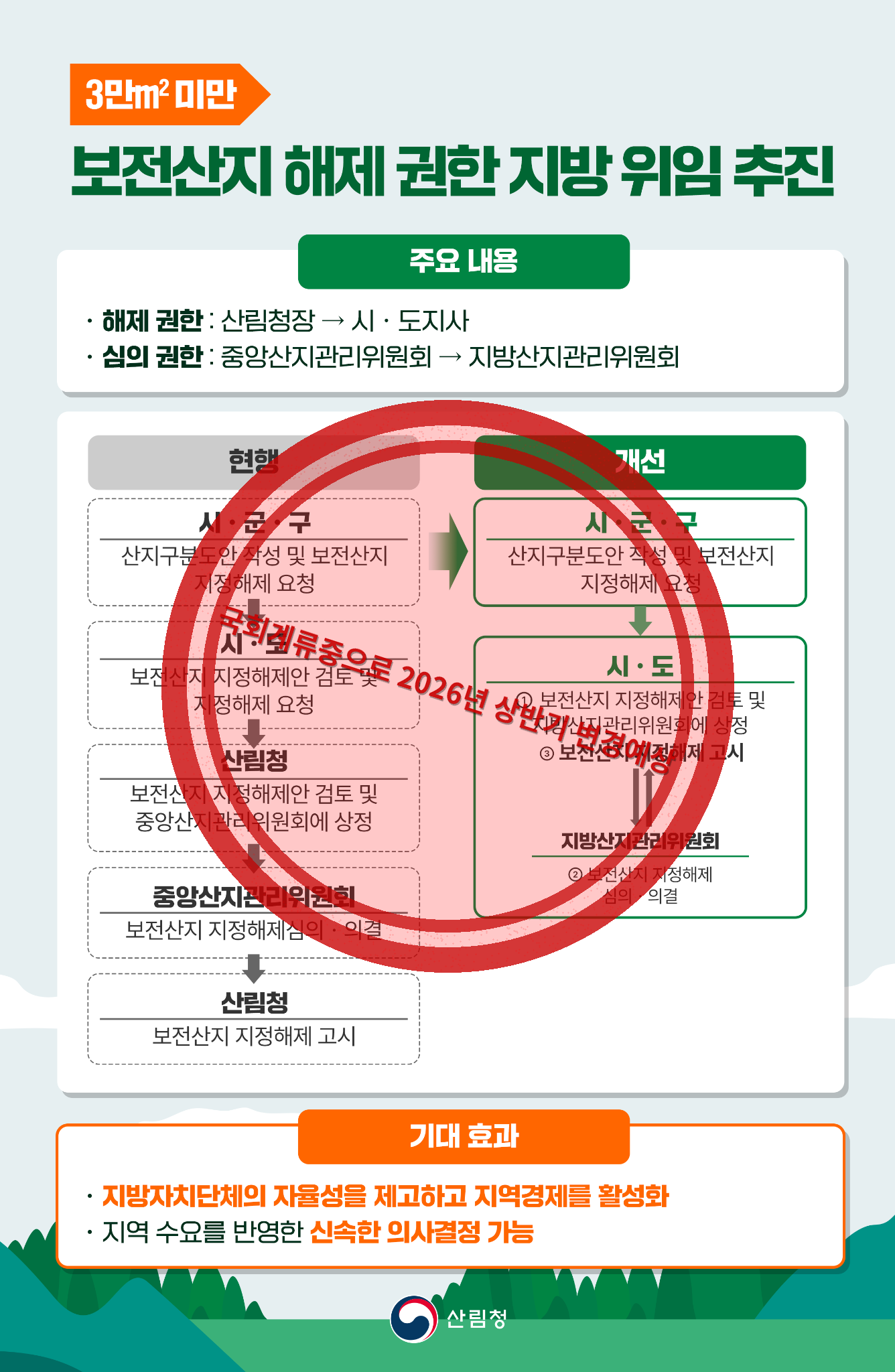 최근에는 지역 수요를 반영한 신속한 의사결정과 지역경제 활성화를 위해, 3만㎡ 미만 보전산지 해제 권한을 산림청장 → 시·도지사로, 심의권한을 중앙산지관리위원회 → 지방산지관리위원회로 위임하는 입법이 국회에 계류 중이며, 산림청 산림정책과는 2026년 상반기 시행을 전망하고 있습니다. 실제로 여러 지자체에서 도시계획·생활SOC와 연계한 지정해제를 검토·추진하는 사례가 증가하고 있어, 지역 산업기반 및 정주여건 개선의 촉매로 작동할 가능성이 커졌습니다.