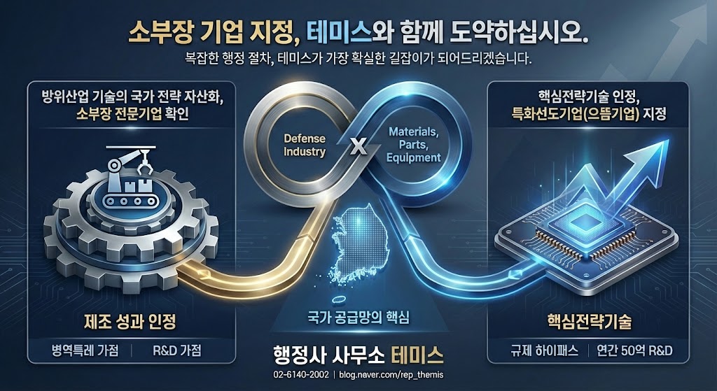 특히 국가의 명운을 좌우하는 첨단 기술을 보유한 방위산업 기업들에 있어 소부장 기업 지정은 단순한 인증을 넘어, 정부가 보증하는 '전략 자산 기술 보유 기업'이라는 공신력을 확보하는 핵심 수단입니다. 행정사 사무소 테미스(Themis)는 복잡한 법리적 요건과 정책적 우대 정책을 분석하여, 귀사의 독보적인 기술이 국가 전략의 중심에서 최고의 혜택을 누릴 수 있도록 실무적인 가이드라인을 제시해 드립니다.
