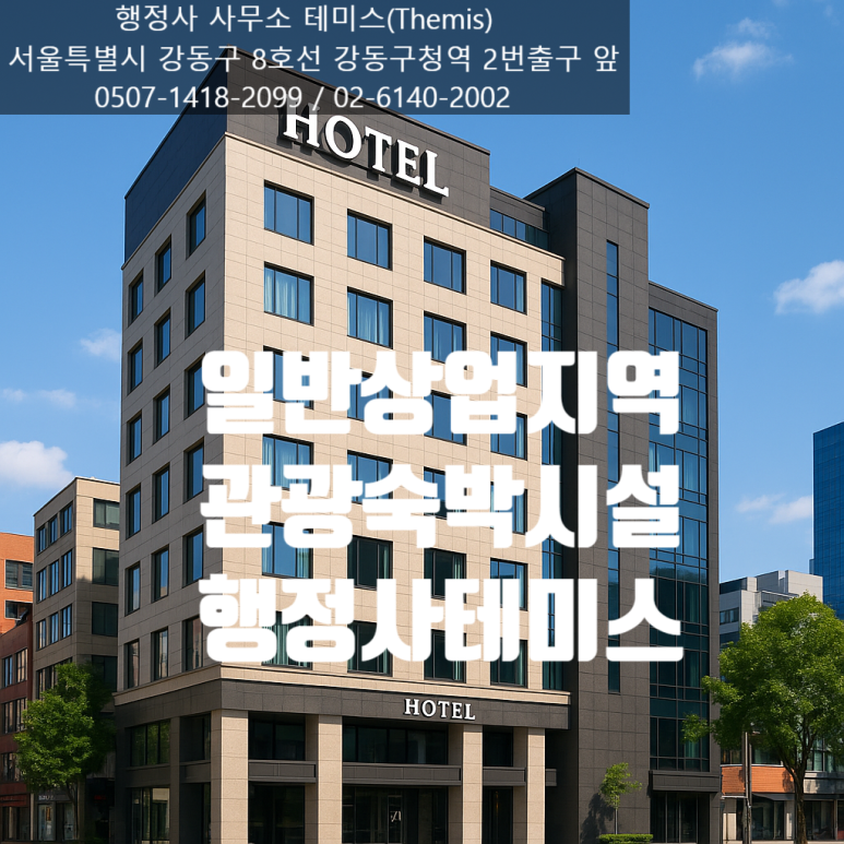 반면, 관광호텔·전통호텔·가족호텔·호스텔·소형호텔·의료관광호텔·휴양콘도미니엄 등으로 구분되는 관광숙박시설은 건축법 시행령 별표 1 제15호 숙박시설 중 나목에 해당합니다. 따라서 이들은 상위법상 이격거리 규제(국토계획법 제71조 등, 도시계획 조례) 적용 대상이 아니며, 원칙적으로 일반상업지역 내에서 설치가 가능합니다.