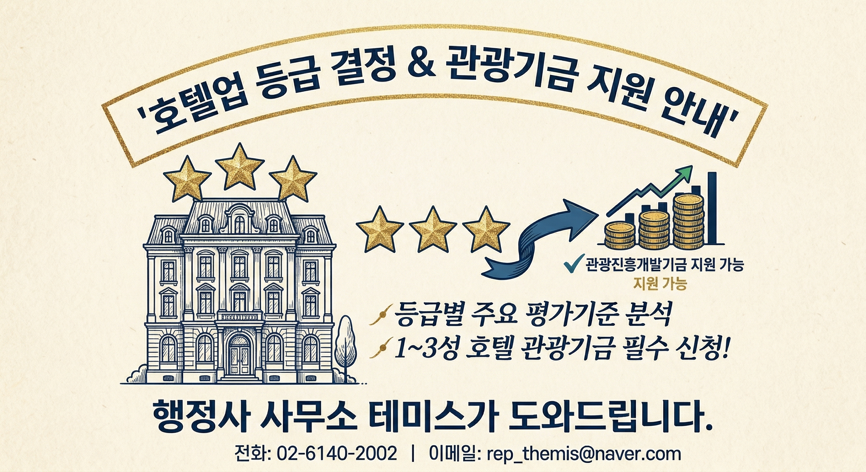 행정사 사무소 테미스는 호텔업 등록부터 등급 신청, 보류 결정에 대한 이의신청 및 보완 대응까지 모든 과정을 전문적으로 조력합니다. 특히 사업자의 자산 가치를 높이고 정책 자금 활용을 극대화할 수 있는 맞춤형 등급 전략을 제시해 드립니다. 귀사의 소중한 호텔이 그 가치에 걸맞은 '별'을 달 수 있도록, 테미스가 든든한 파트너가 되어드리겠습니다.