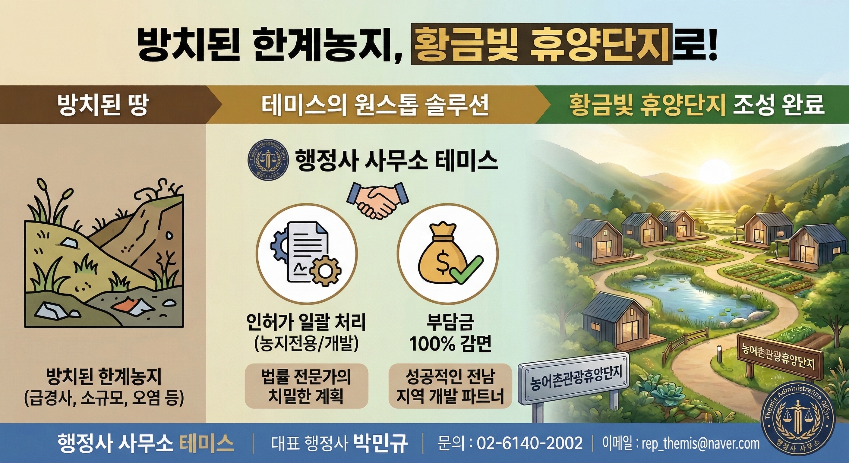 이러한 고질적인 문제를 해결하기 위해 행정사 사무소 테미스는 「농어촌정비법」에 명시된 '한계농지 정비지구 지정'이라는 전략적 카드를 제시하며, 이는 단순히 생산성이 낮은 토지를 정리하는 수준을 넘어 고부가가치 관광 시설로 탈바꿈시키는 강력한 법적 도구가 될 것입니다. 이번 칼럼을 통해 전남 농어촌의 실제 사례를 바탕으로 2026년 최신 법령이 보장하는 한계농지 개발의 성공 방정식을 심도 있게 분석해 드리겠습니다.
