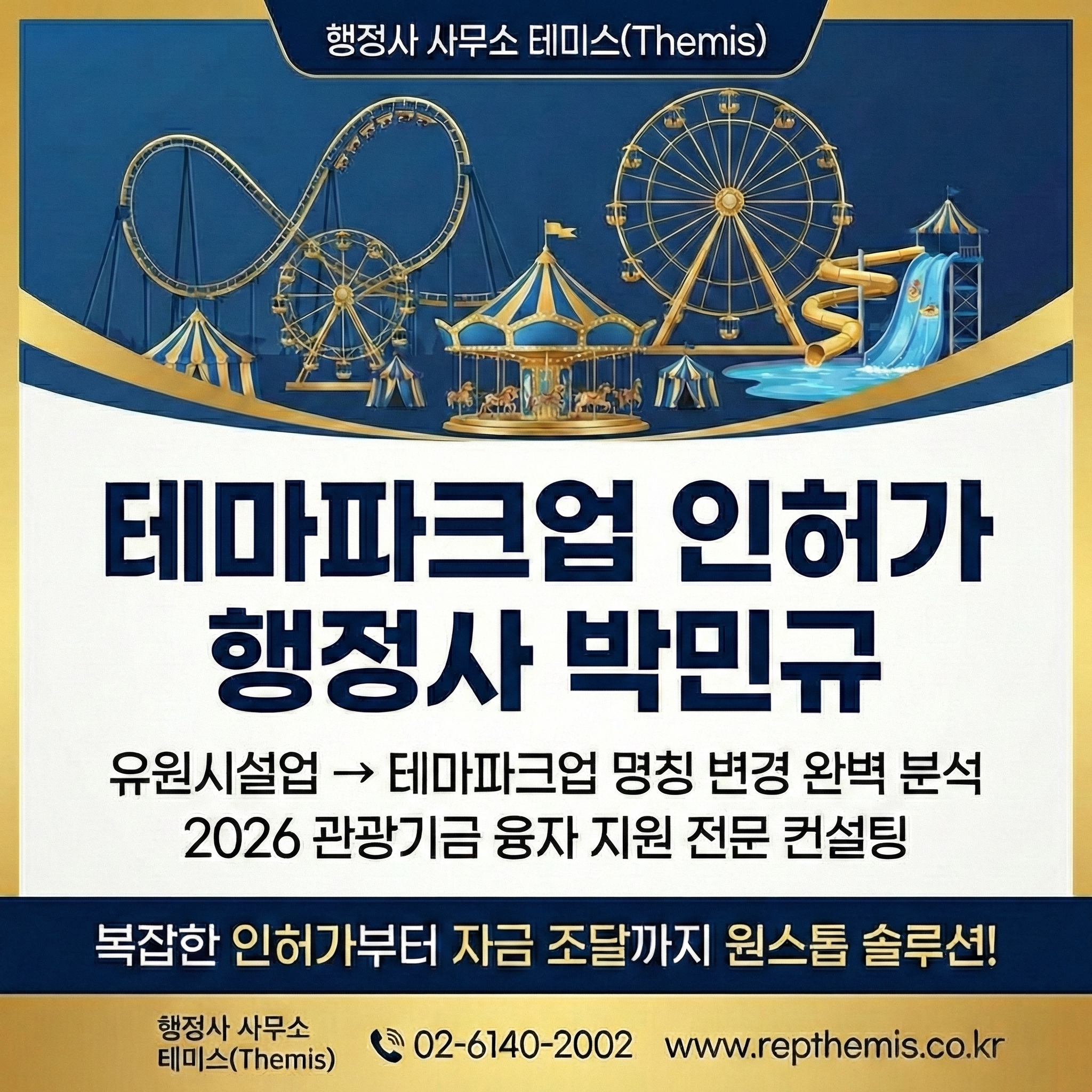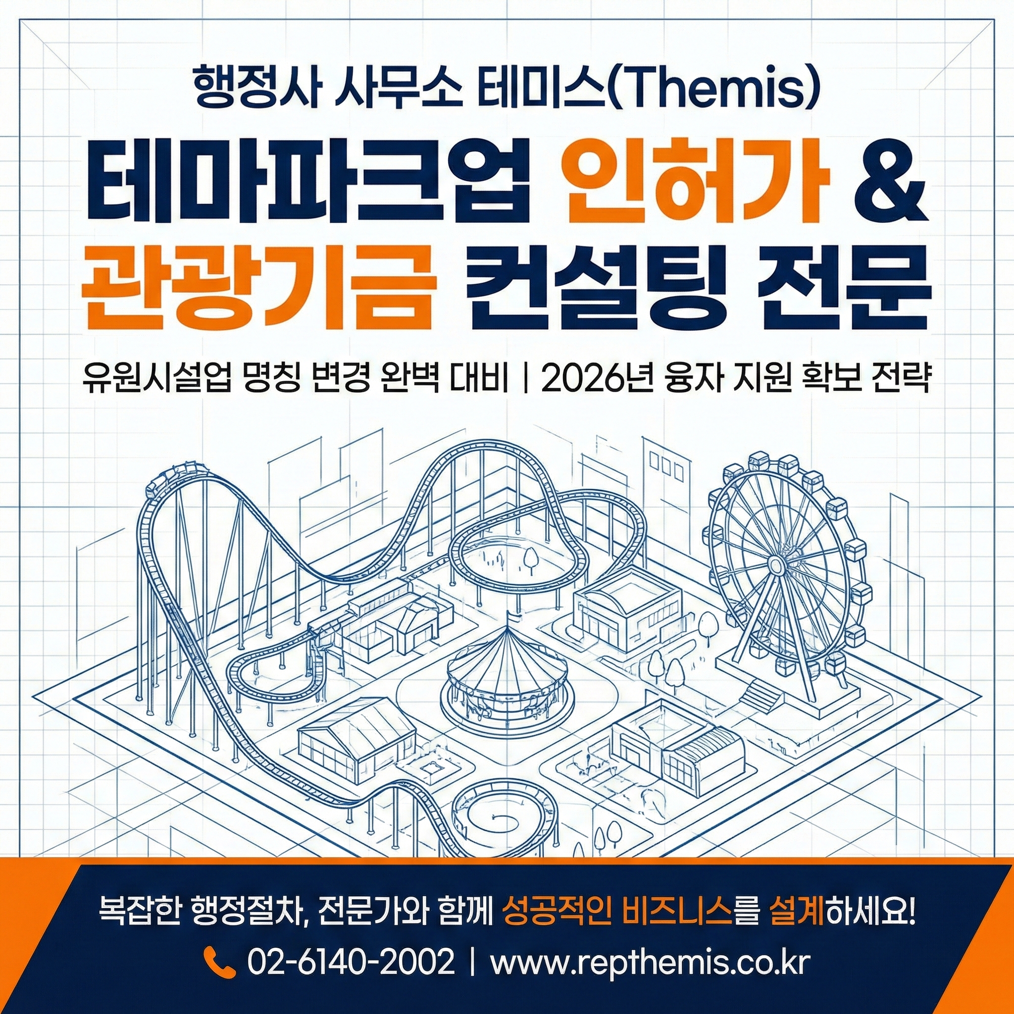 행정사 사무소 테미스(Themis)는 의뢰인의 상상이 도면을 넘어 실제 수익을 내는 테마파크로 탄생할 수 있도록 가장 날카로운 법률 분석과 자금 확보 전략을 제공합니다. 규제의 파고를 넘어 성공적인 창업을 원하신다면, 지금 바로 전문가와 상의하십시오.