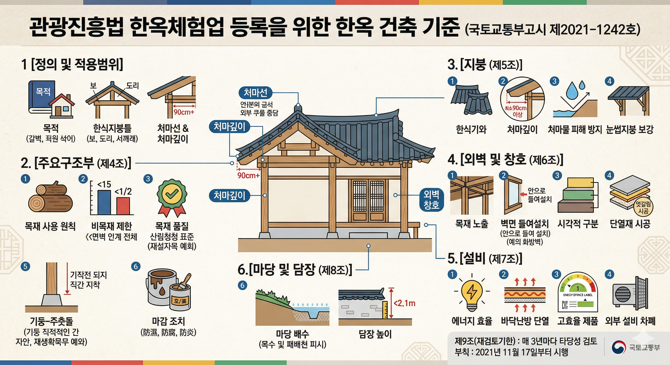 | 지붕 및 처마 | 한식기와의 사용을 원칙으로 하며, 처마깊이는 최소 90cm 이상 확보해야 합니다. | 외벽 기둥 중심에서 처마선까지의 수평 거리를 엄격히 측정합니다. |