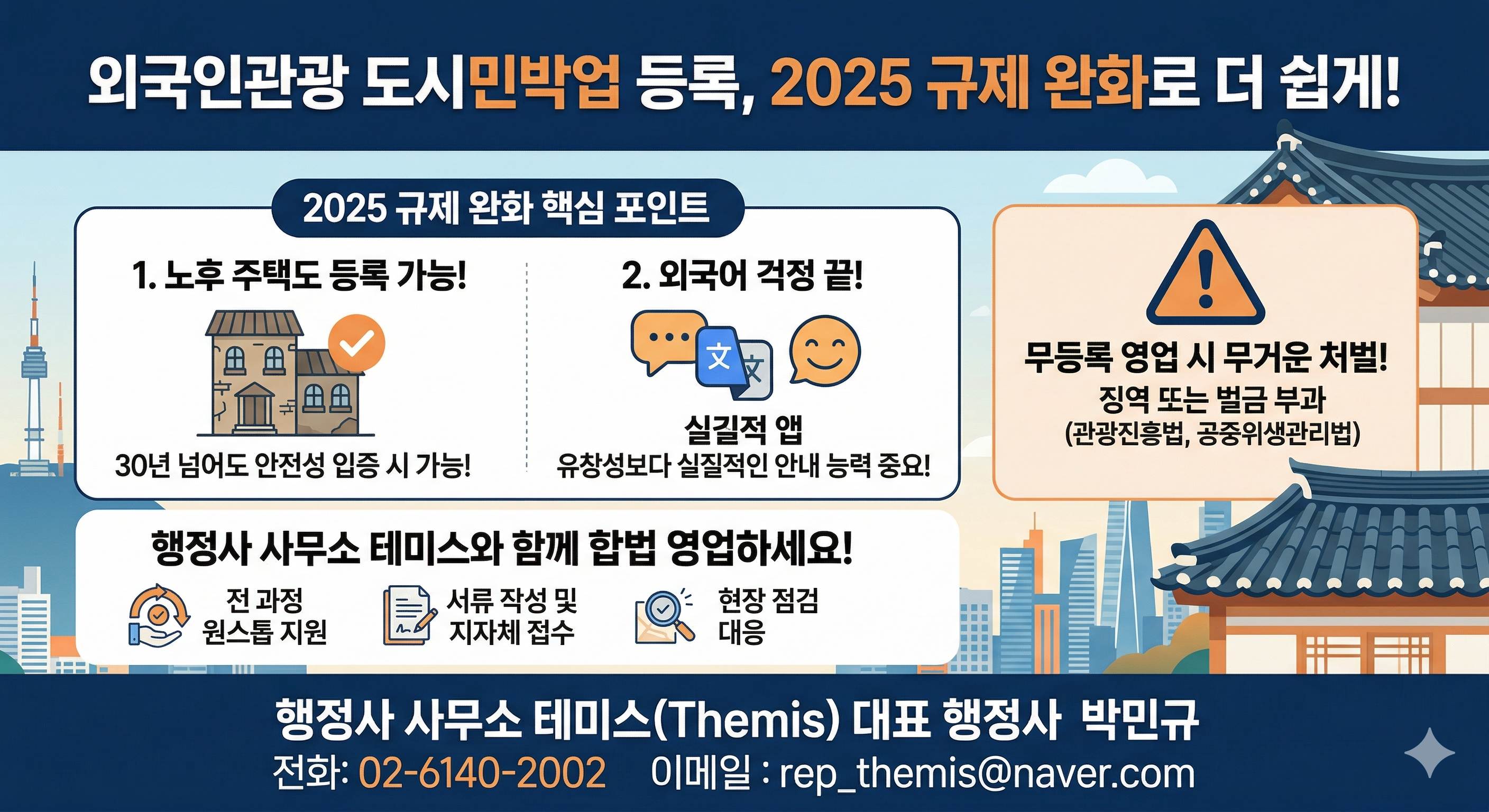 이러한 치명적인 법적 리스크를 피하고 합법적인 테두리 안에서 운영하기 위해서는 반드시 '외국인관광 도시민박업'으로 등록해야만 합니다. 다행스럽게도 2025년 10월, 문화체육관광부의 업무처리 지침 개정으로 까다로웠던 진입 장벽이 대폭 낮아졌습니다. 오늘 행정사 사무소 테미스에서는 예비 호스트 여러분을 위해 규제 완화의 핵심 포인트부터 실무적인 등록 절차까지 명쾌하게 짚어드리겠습니다.